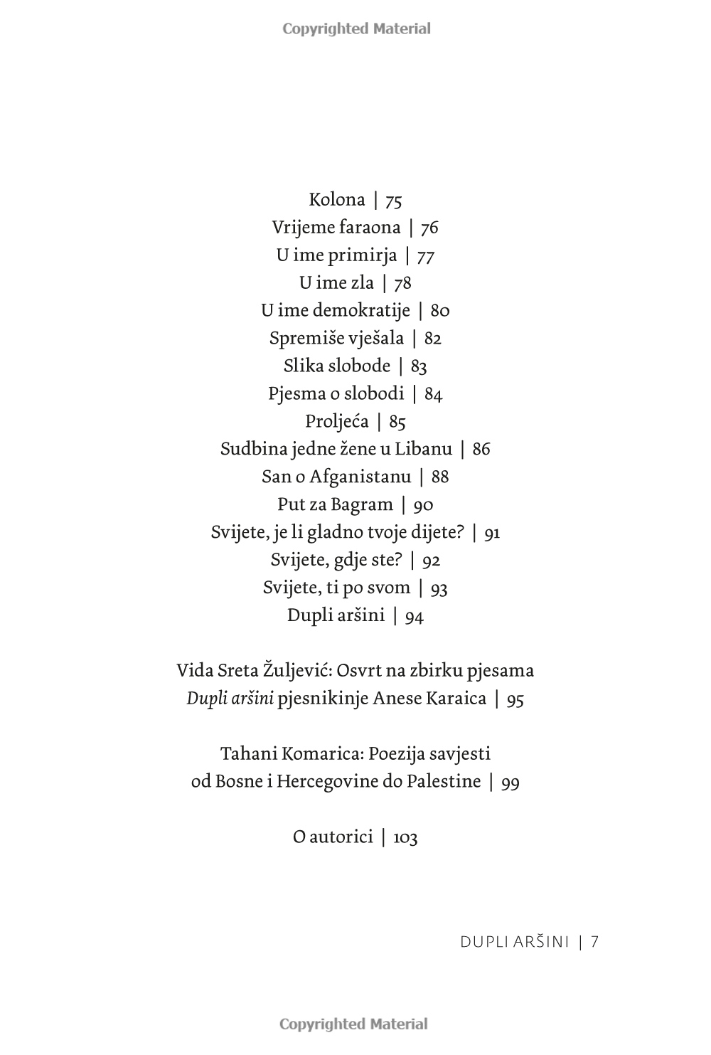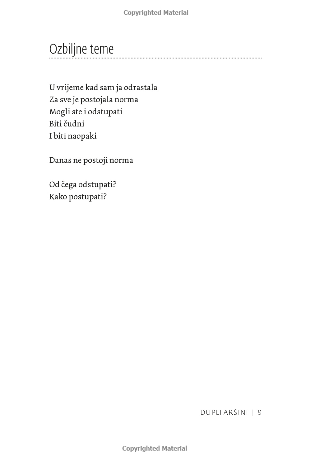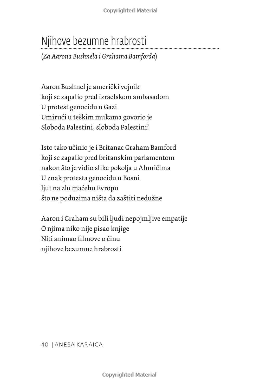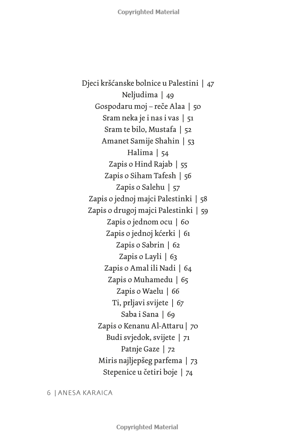 ”Verkligen allvarliga ämnen, och det är just titeln på den första dikten som författaren Anesa Karaica väljer att inleda sin diktsamling med. Kanske finns det i dessa korta liv inget allvarligare ämne än det globala hyckleri som omger oss i nästan varje ögonblick av våra liv. Lyckliga är de som har verkliga stunder av vila som ger dem en moralisk norm.